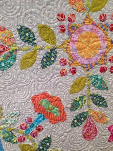 I have taught Kim Diehl’s “Serendipity Sampler” quilt from her book, Simple Comforts to many people as a beginner hand applique block-of-the-month class. It’s a great class because my beginners realize that freezer paper applique just isn’t that hard! At my last block of the month, Sue made her beautiful modern version. Gina Allen quilted it for her and it is hanging behind the counter at The Little General.