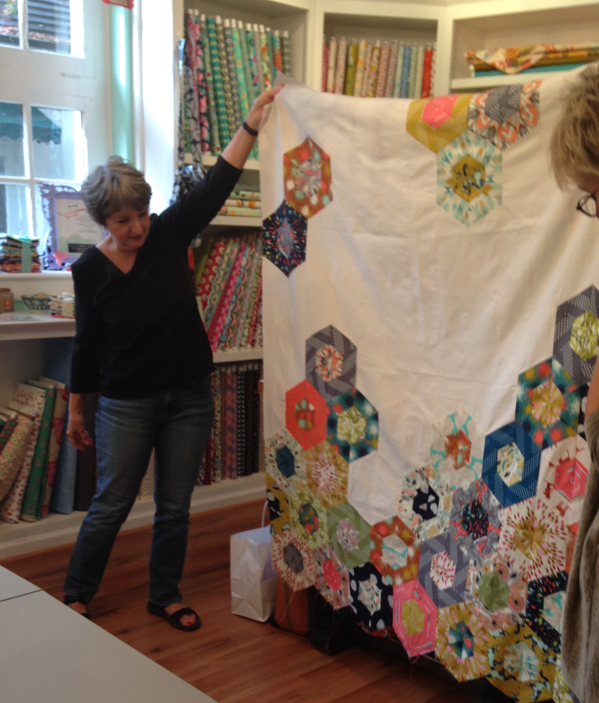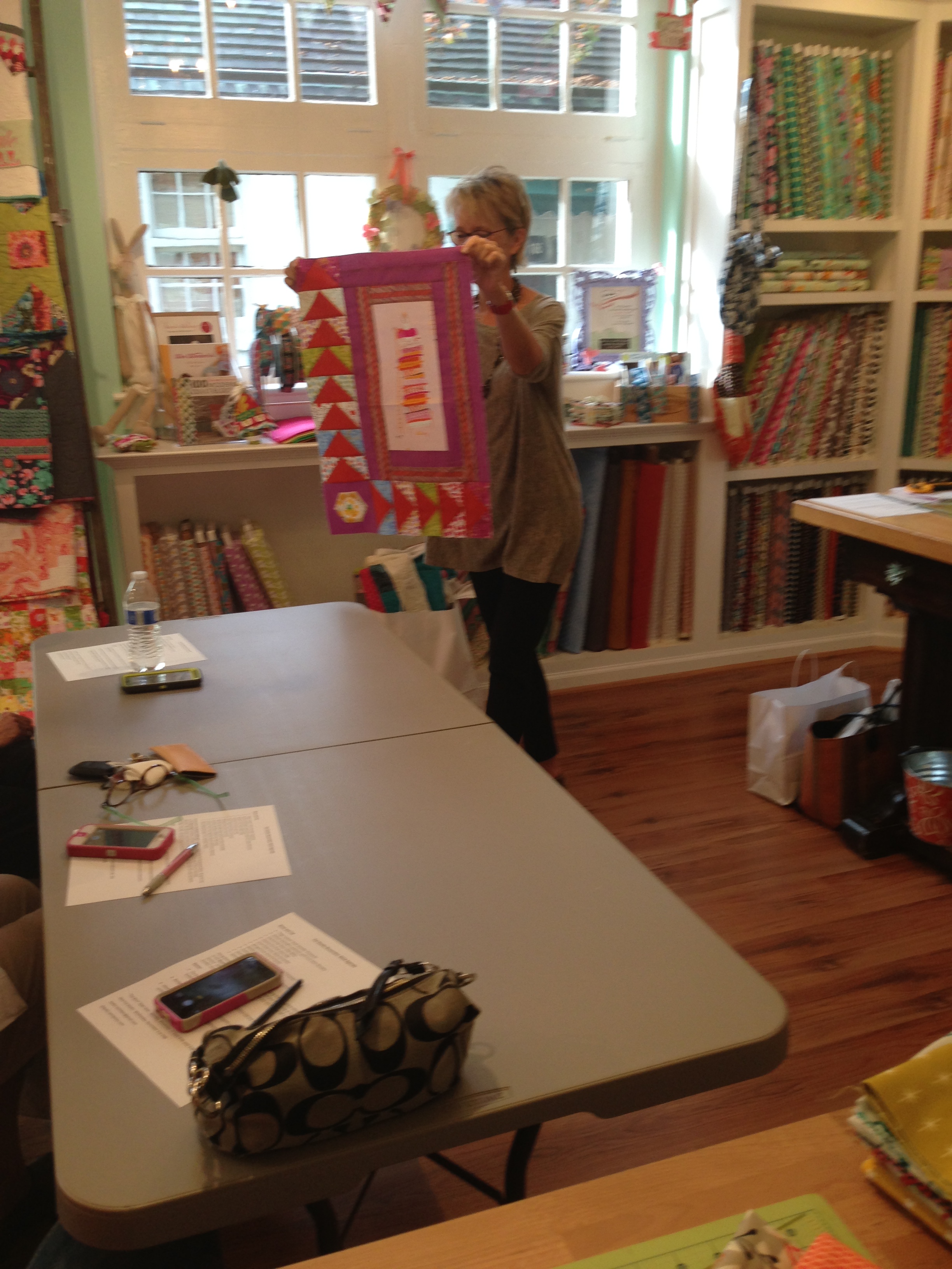 Here’s the infamous bubble quilt…without the ruffle! Ha!! I did a demo on how to construct this great baby quilt. There were a few disparaging remarks but it scored high marks in our baby focus group! Laurie’s comment was the best: “awkwardly cute!”