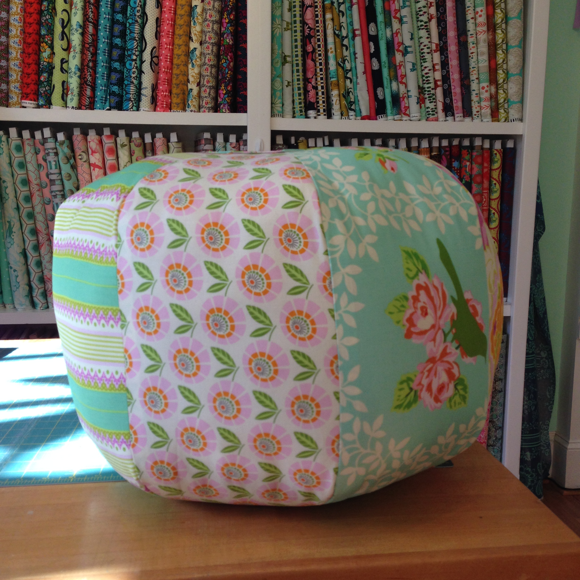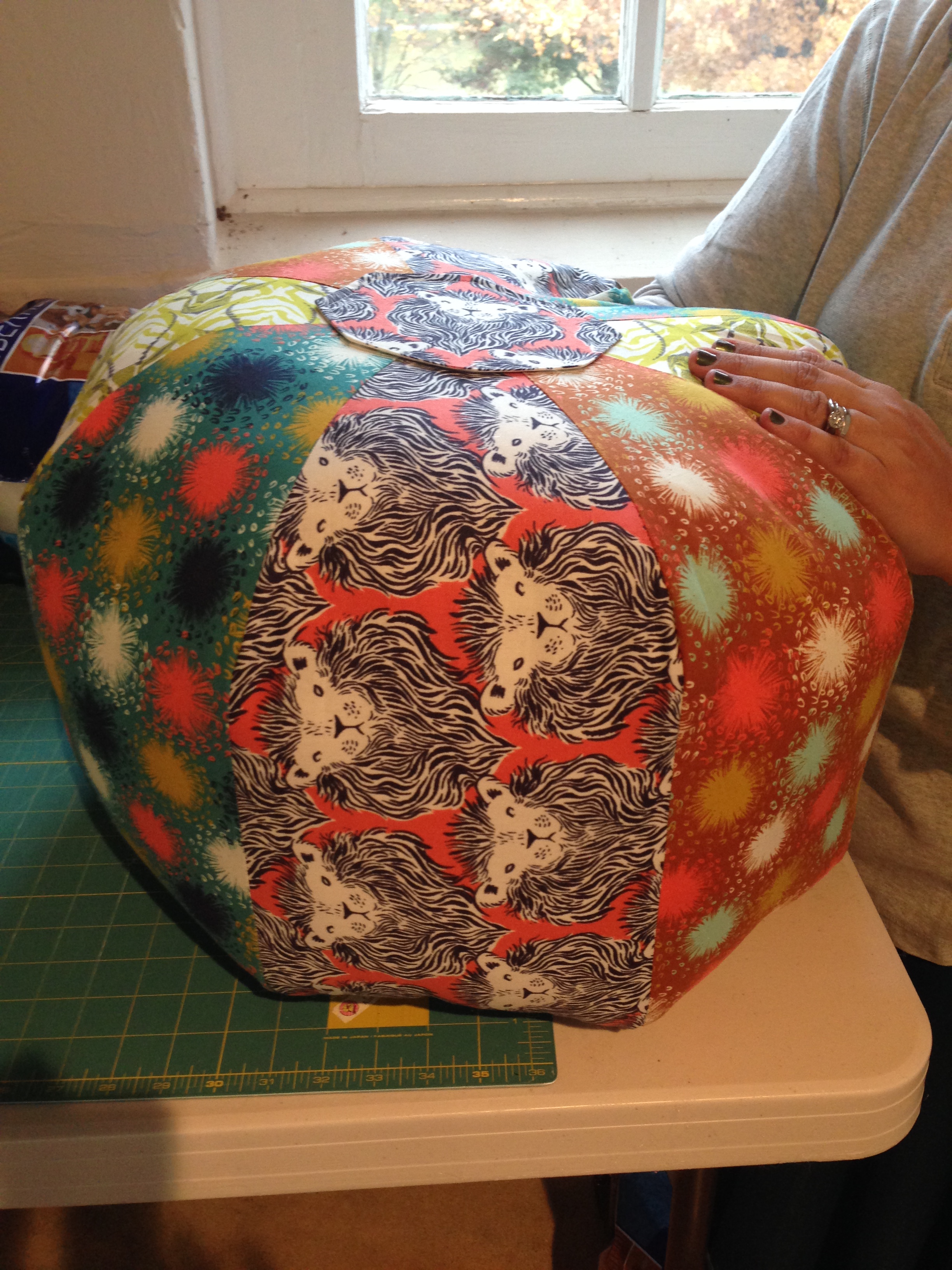 It’s the Amy Butler 18″ gumdrop pillow; the pattern has been around since 2007! Margaret picked out the four fabrics and I stitched and stuffed it and now it sits in her office.