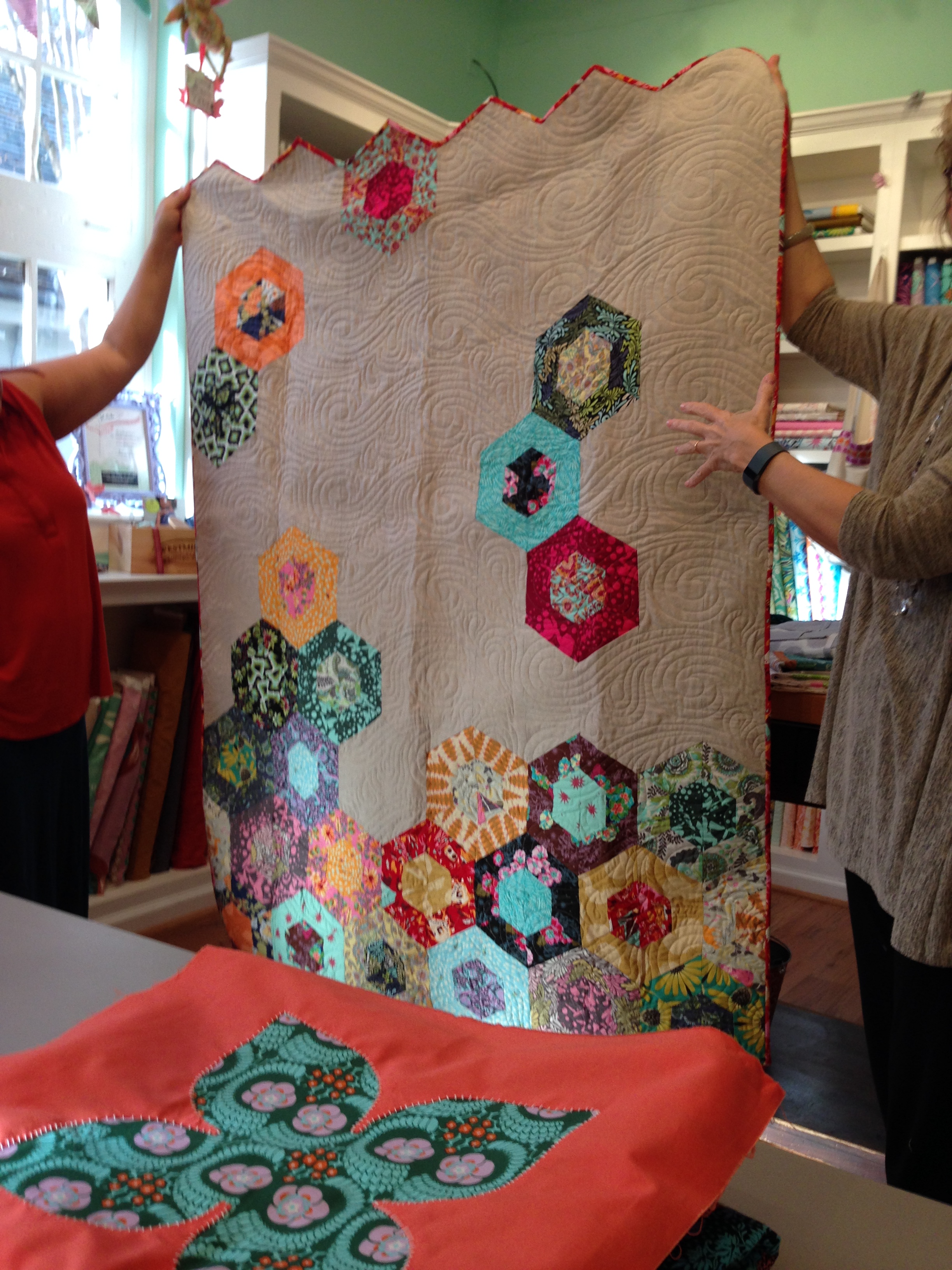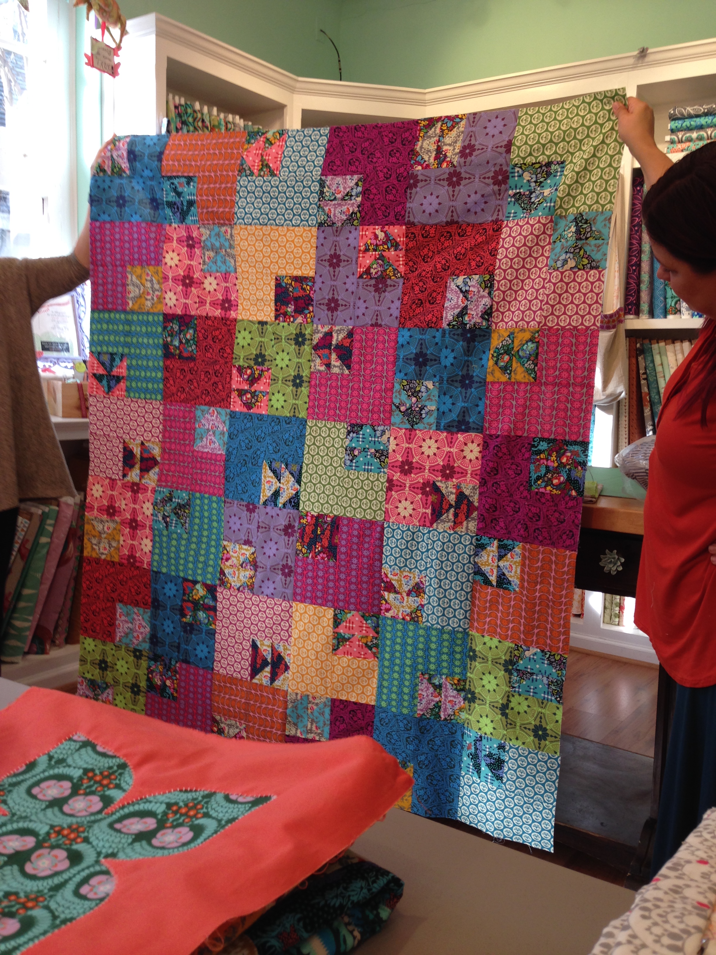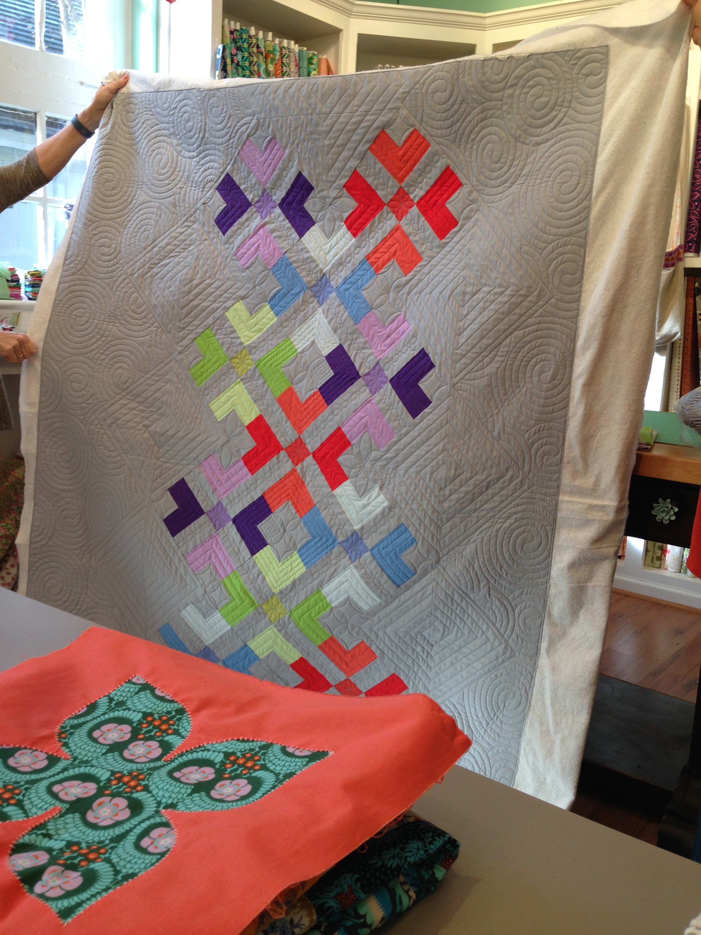 Sandra’s Serendipity Sampler. I taught her how to applique! She used a Heather Bailey fat stack.