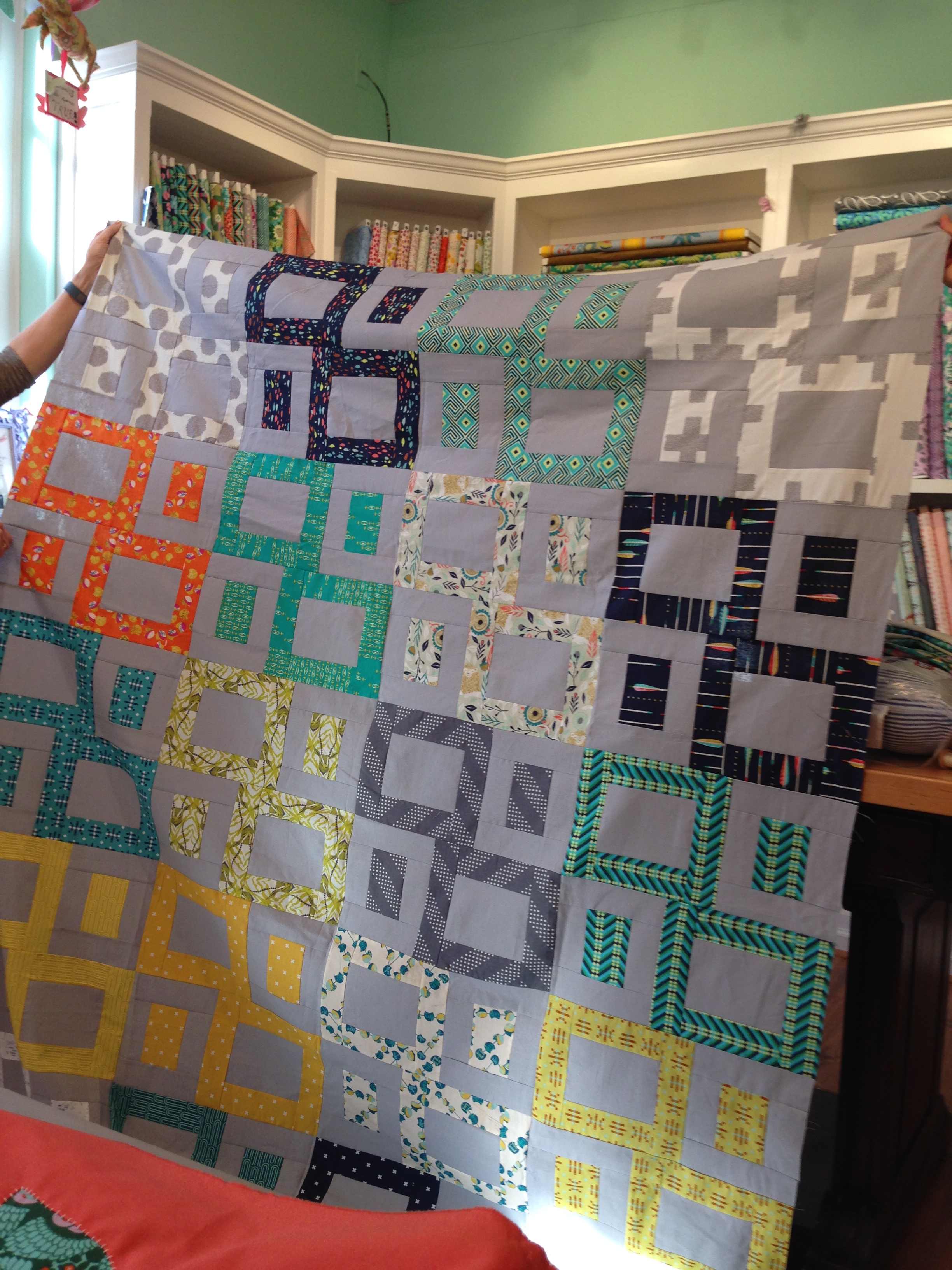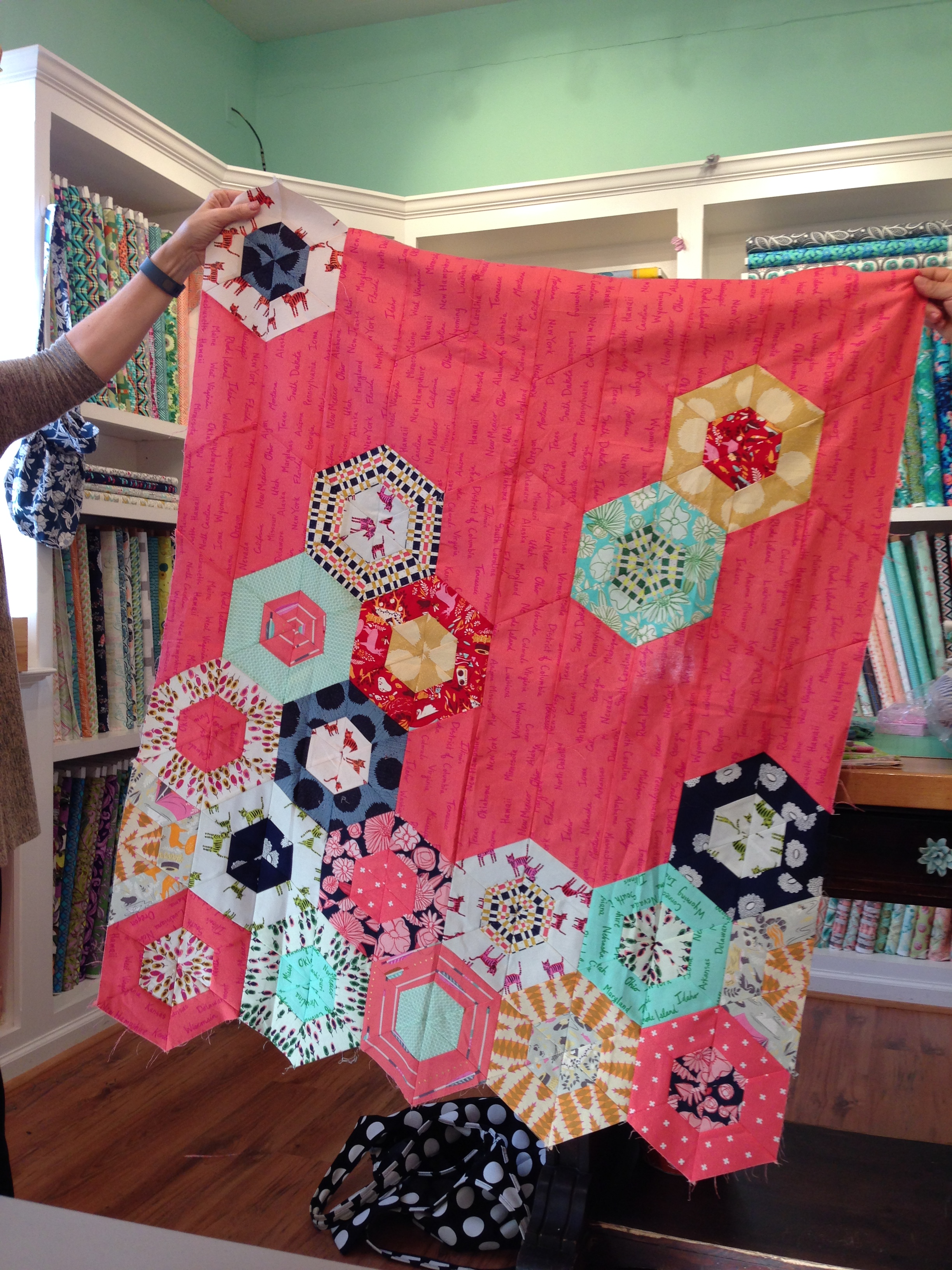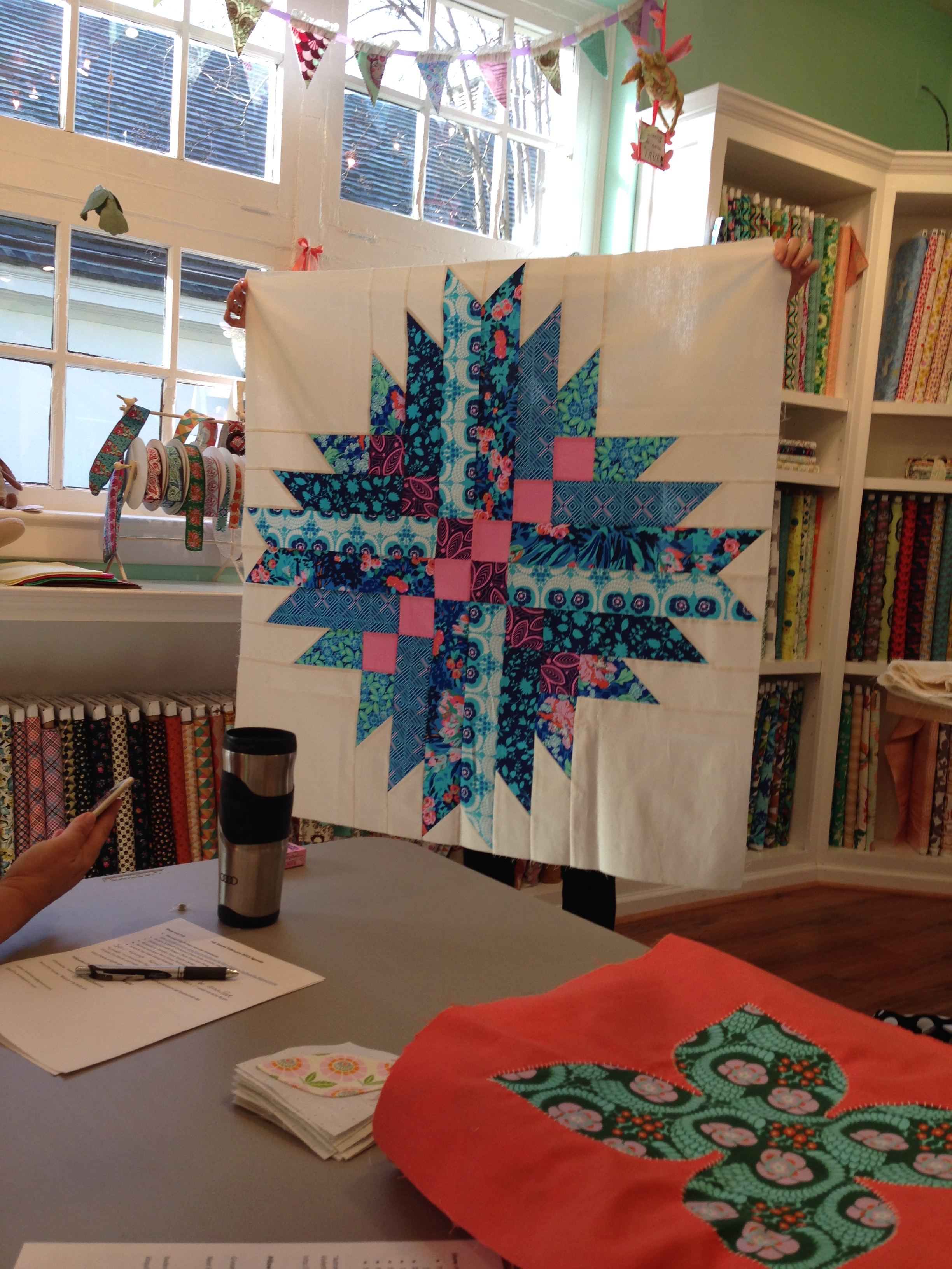 Sandra’s Serendipity Sampler. I taught her how to applique! She used a Heather Bailey fat stack.