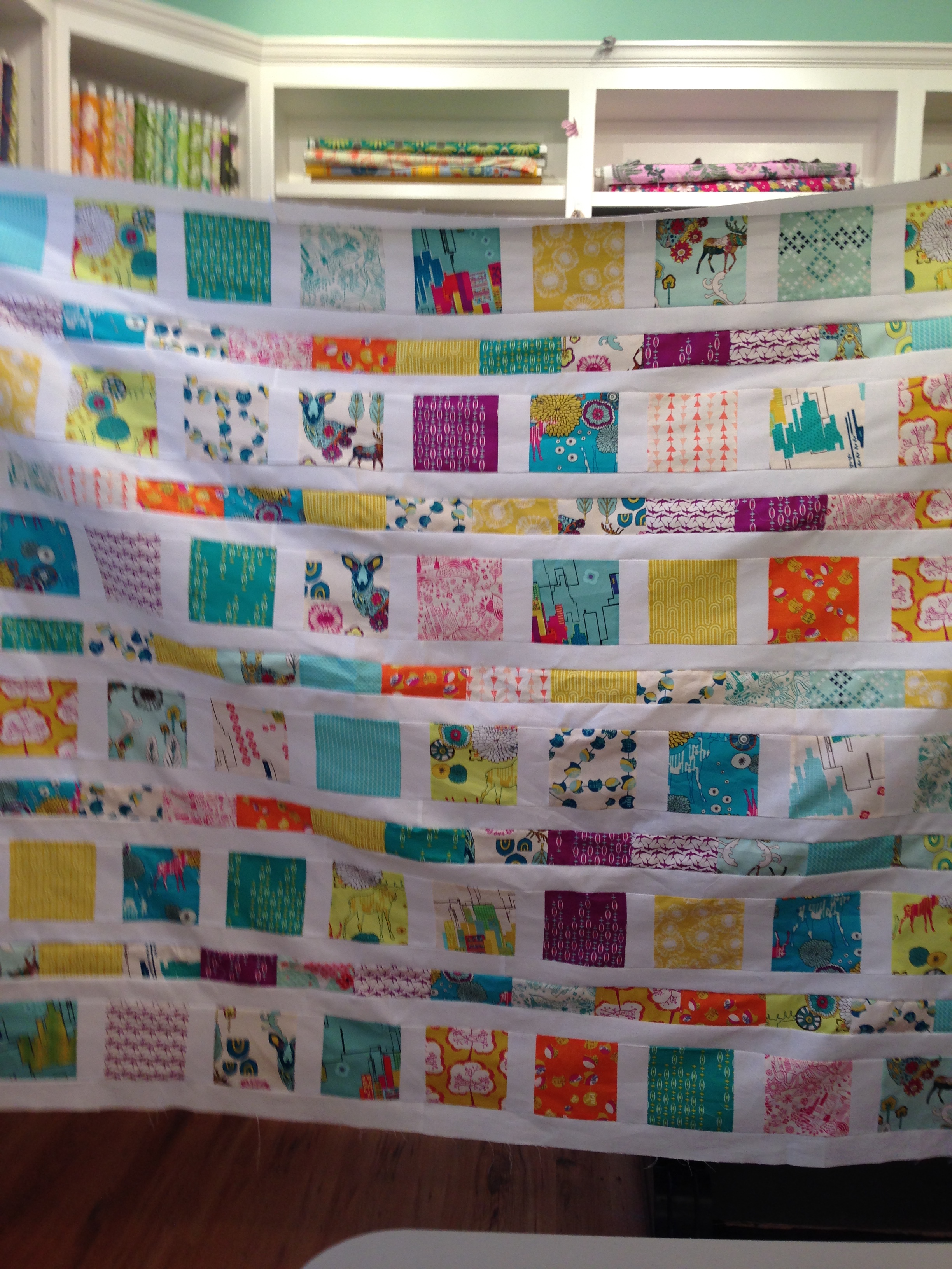 We had a great turnout for our March Fat Stacks class at The Little General. Ann’s beautiful “Flowers in the Sunshine” brightened up the room! I love this quilt; she plans to add three more rows.