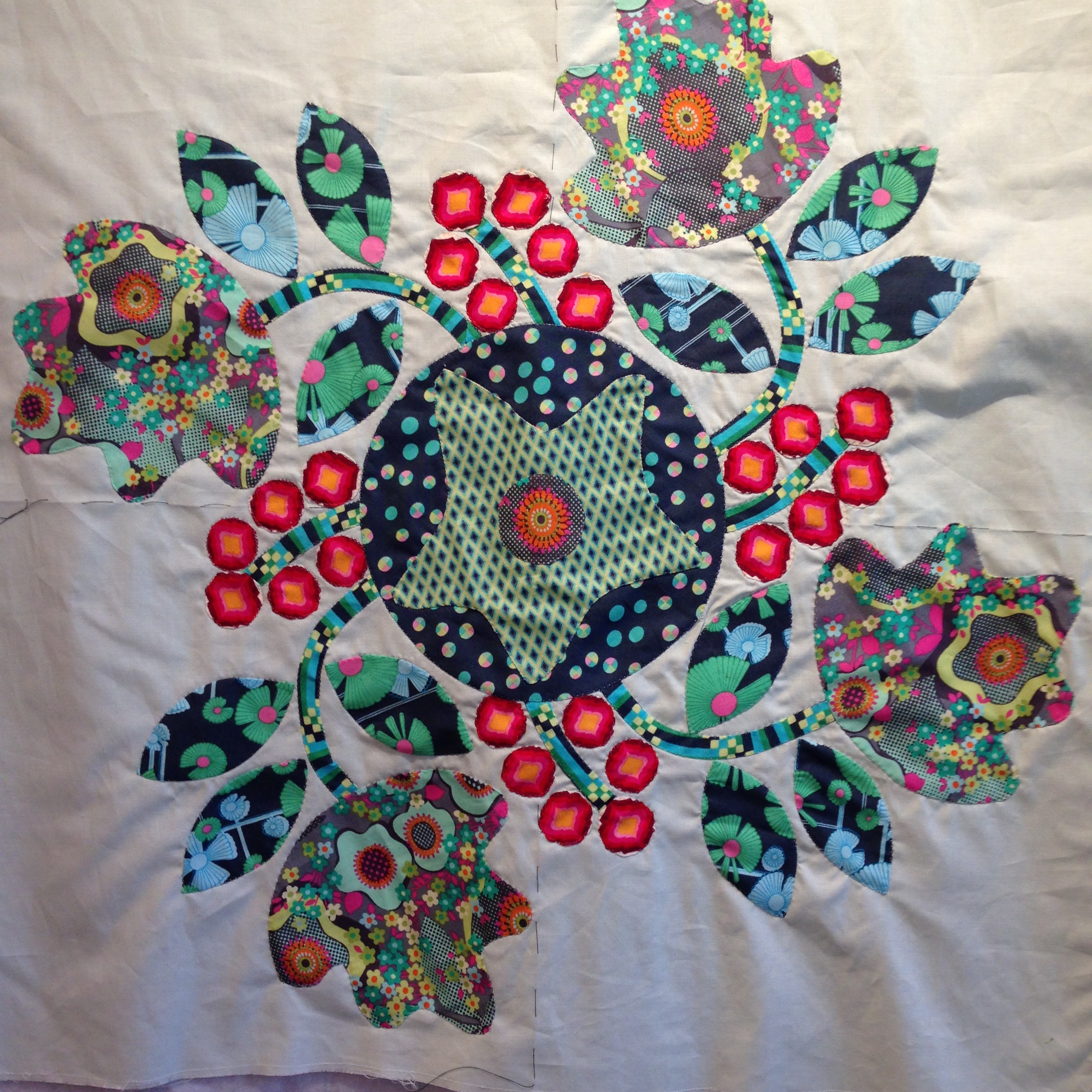 IMG_5242Cheryl’s fourth block.  She has a little more work to do but you get the idea; it’s going to be fabulous!  She decided on her berries this month.  Check!