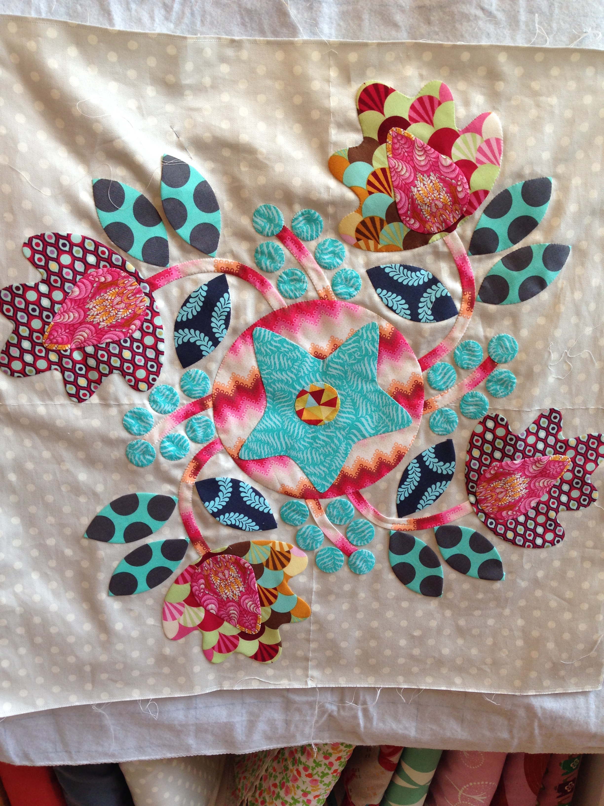 IMG_5248Sue’s fab fourth block.  Her work is SO GOOD.  (Did I tell you I taught her how to applique??)