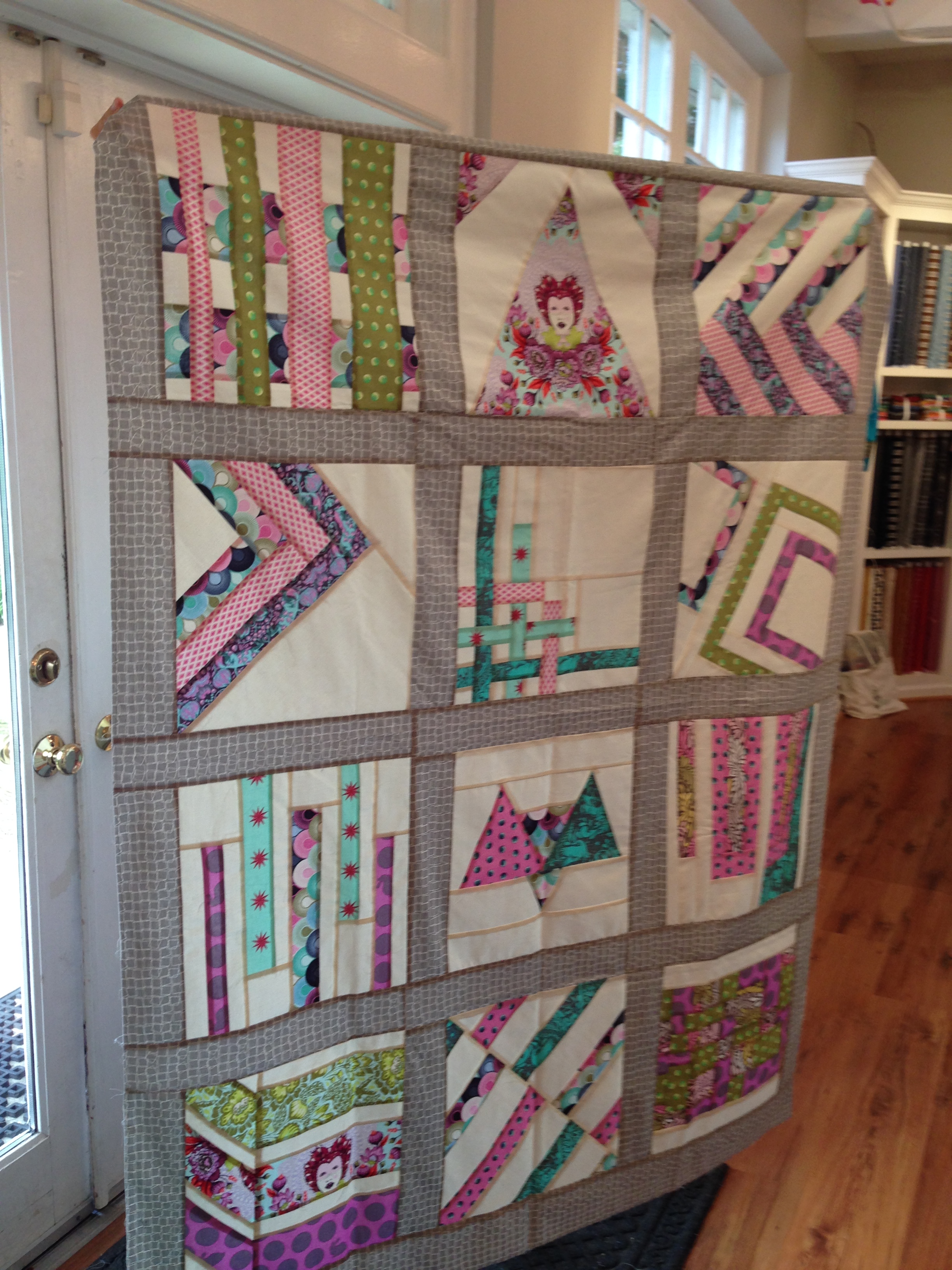 Jennifer B’s wonky log cabin. Wonky is hard; Jennifer did a great job with this quilt. She mixed some hand quilting with her own machine quilting.