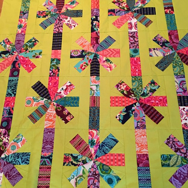 Amy made me make this; she picked the background. HAHA “Flowers on a String.” I really like it. It’s being quilted and I’ll teach it late this fall. It’s fun!