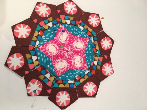 I taught a La Pass class at Trailer Stash a couple of Saturdays ago. Here’s Weeta’s first rosette. Her outer row of pentagons is pretty fun.