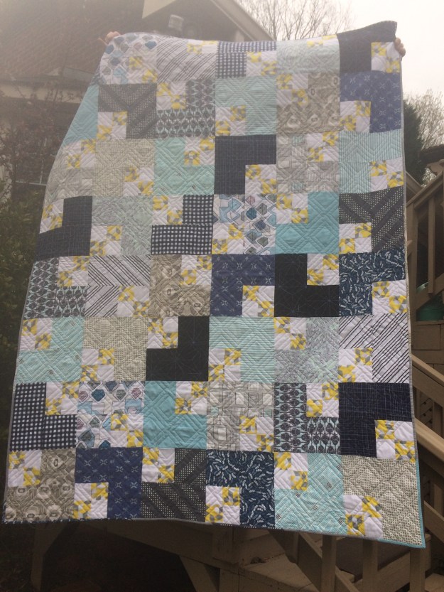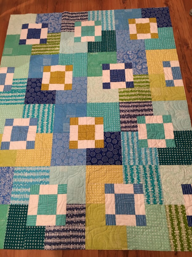 I teach a beginning quilt class at Village Fabric Shop.  I LOVE beginners; they think I know everything!  It really is fun to help them pick fabrics, learn to piece and then surprise themselves with their beautiful tops!  Here are some of their creations.  The pattern comes from Julie Herman’s book, Skip the Borders.img_0036This one belongs to Anne-Marie.   Her 4-patch fabrics were a great pick.