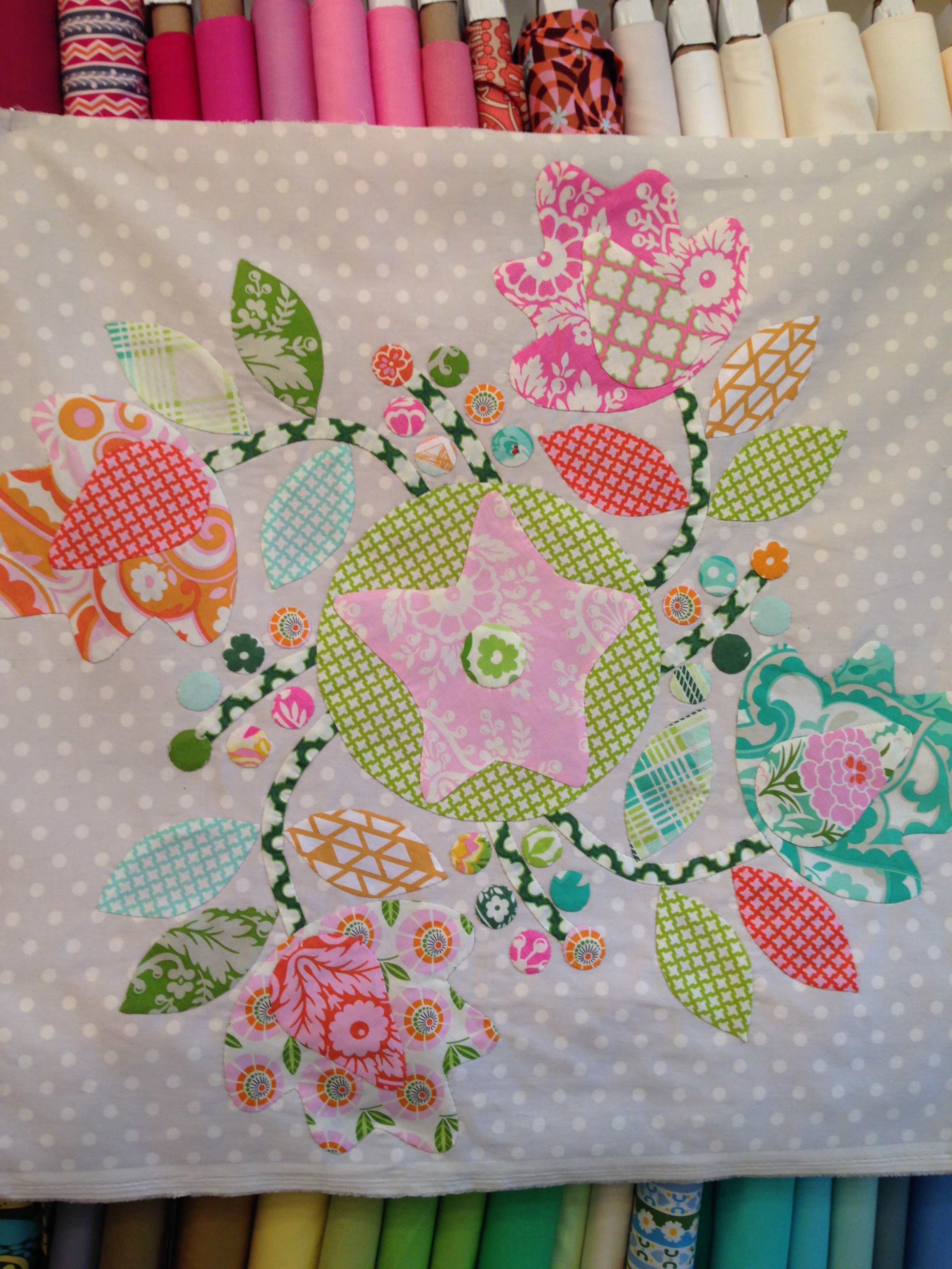 Fowler’s center. She’s using a collection of Amy Butler on a pale yellow background. Very Fowler.