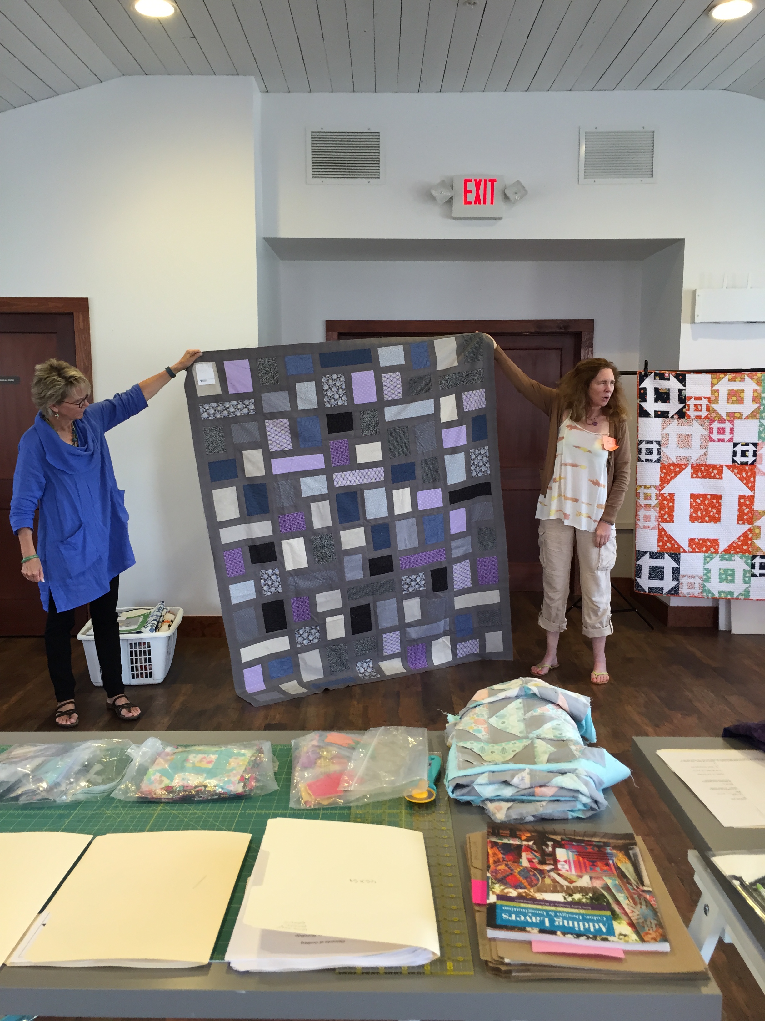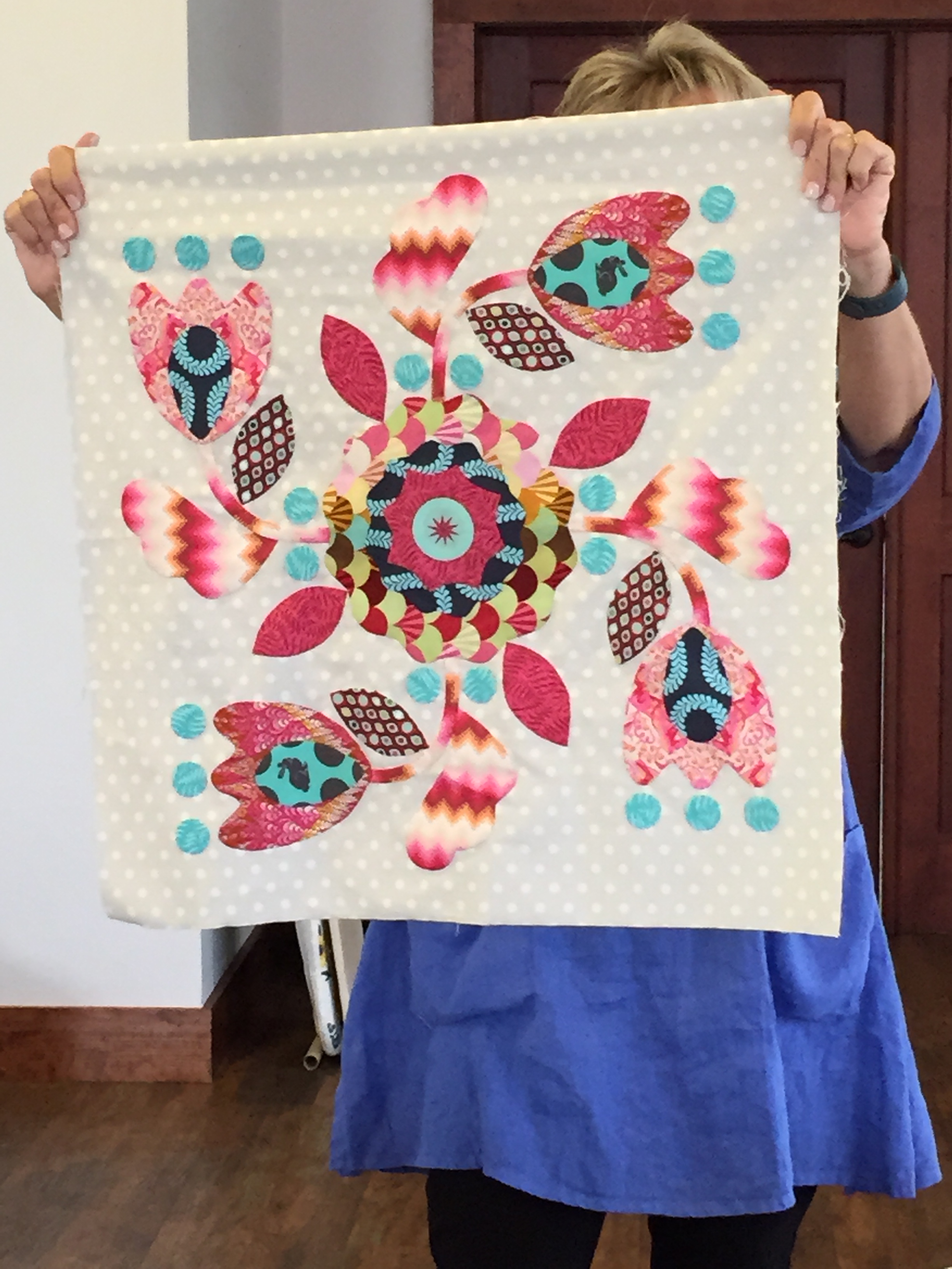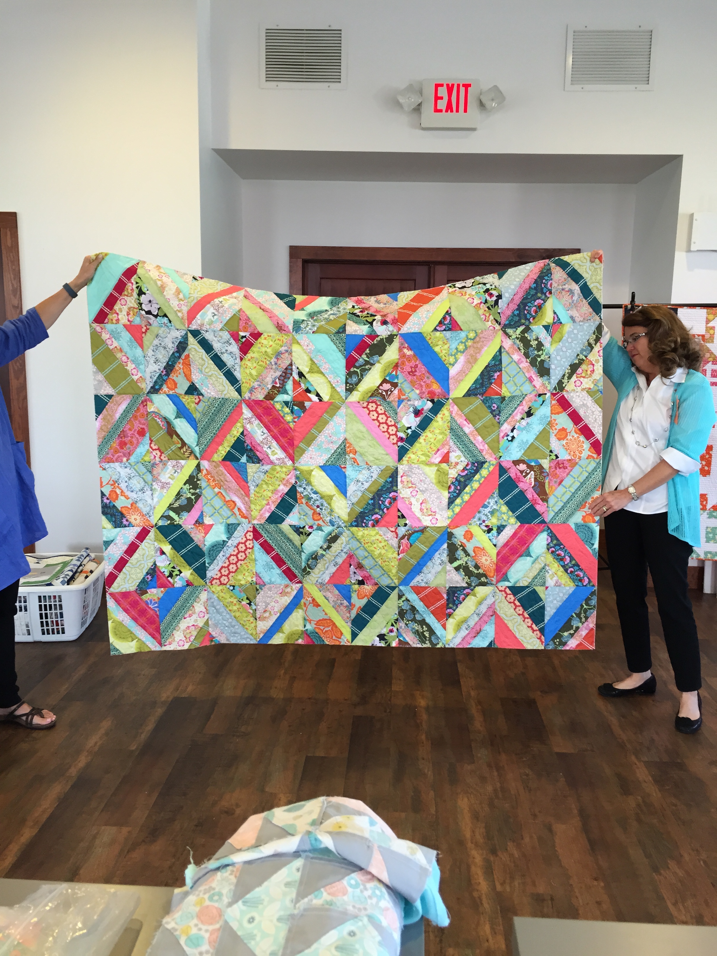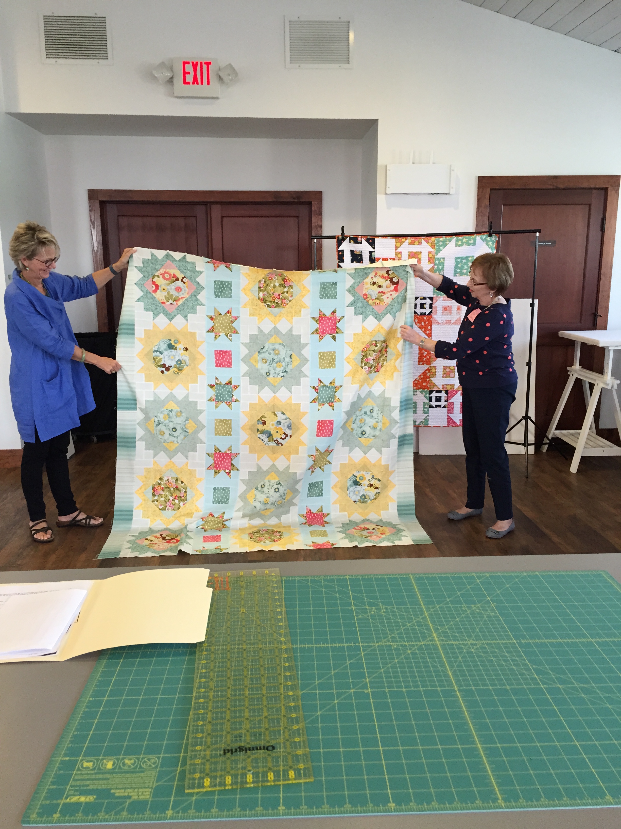 So here’s Beverly’s first big rosette. She has decided it will be the center of her upper left quadrant. I could look at this all day. We met for a little while today at Trailer Stash Fabrics just to “take inventory.”