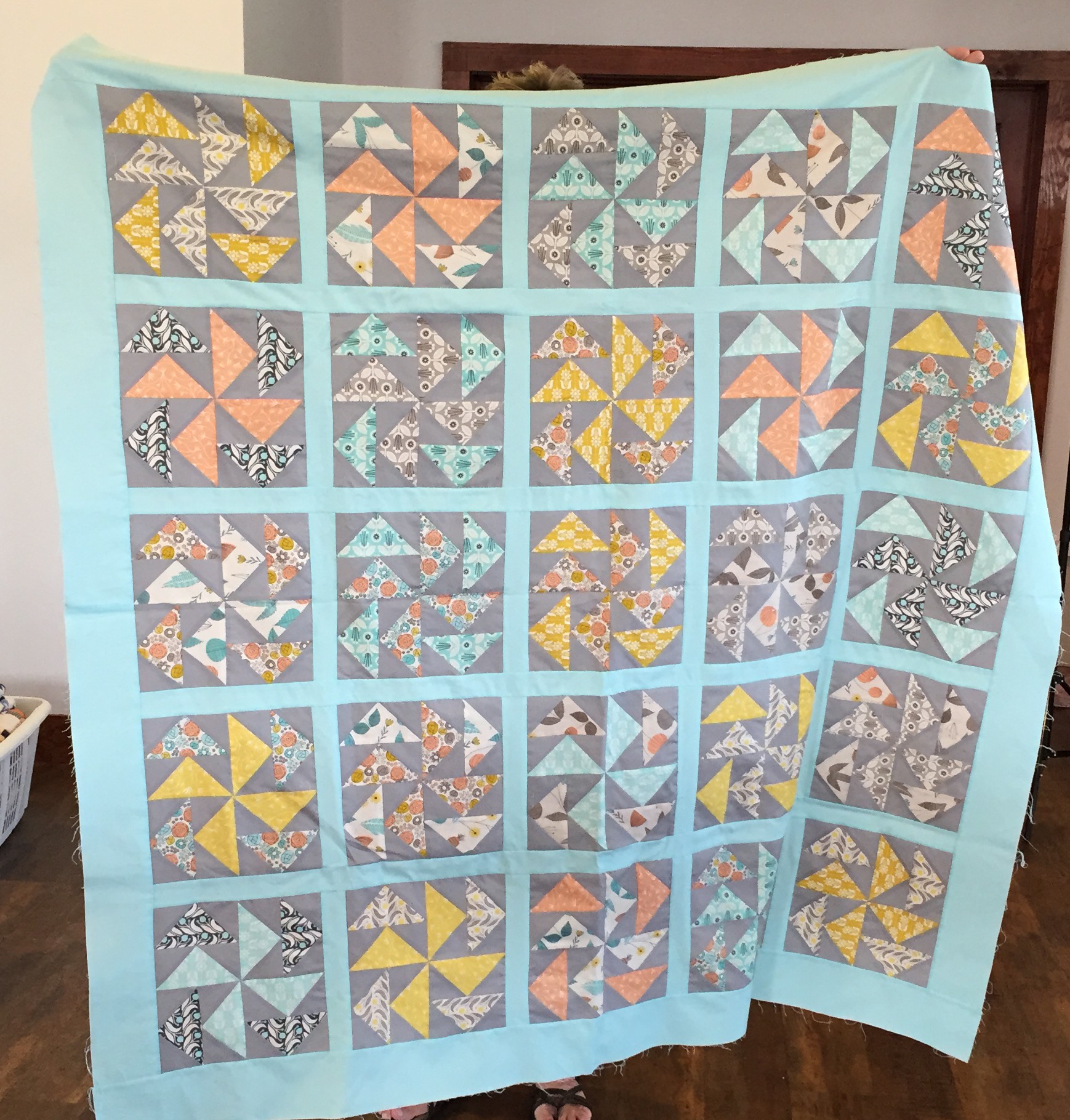 Now she has to choose “star points” to blend all the cogs together. She picked a few fabrics today; she is well on her way.